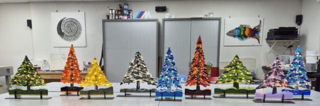 “nieuwe glazen kerstbomen” object nr div afmeting: 1verschillende maten De kerstbomen staan op een standaard Prachtige  kleuren met veel dichroic details     Beschikbaar: ja, in atelier en in de galerie Hieronder nog een foto plat op de tafel ,  toen ie net uit de glasoven kwam . klik op de foto voor grotere afbeelding…