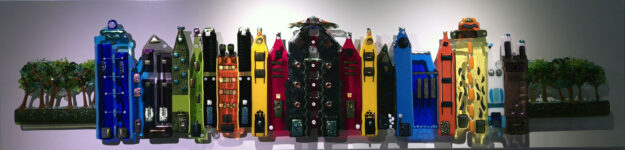 Skyline: Town with golden Church Tower object nr 2516 afmeting: 100 cm breed en 46 cm hoog Dit object kan met speciale afstandssteunen hangen aan de muur prachtige stad met mooie dichroic details     Beschikbaar: ja. (atelier) Hieronder een paar foto’s plat op de tafel,  toen ie net uit de glasoven kwam. klik op…