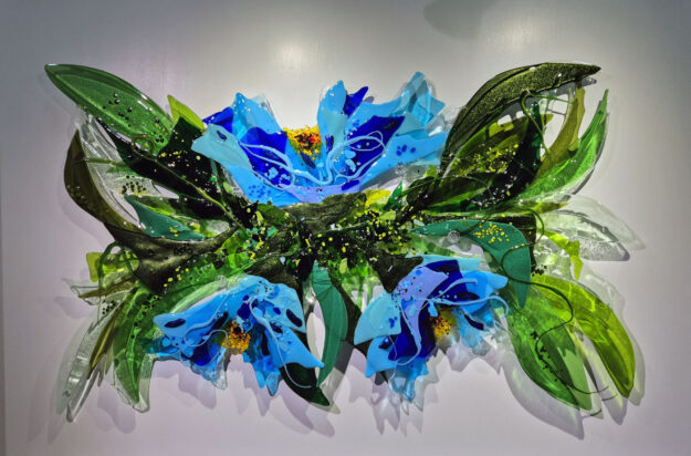 “Blue Flowers wild” object nr 2548 Hangobject voor aan de muur afmeting: 60cm hoog en 100cm breed! Een flinke jongen dus! Dit object  hangt  met speciale afstandssteunen  aan de muur Mooie blauwe kleuren met mooi groen met mooie dichroic details.     Beschikbaar: ja Hieronder nog een foto plat op de tafel ,  toen ie…