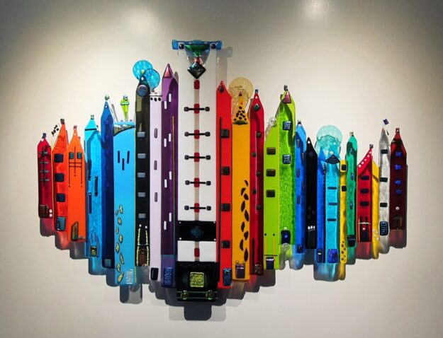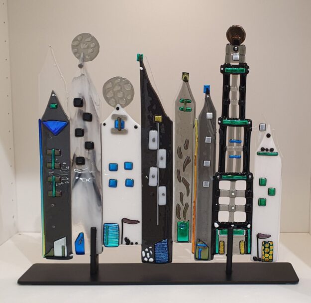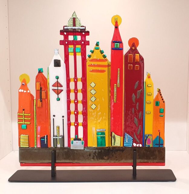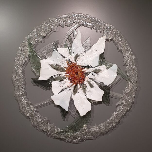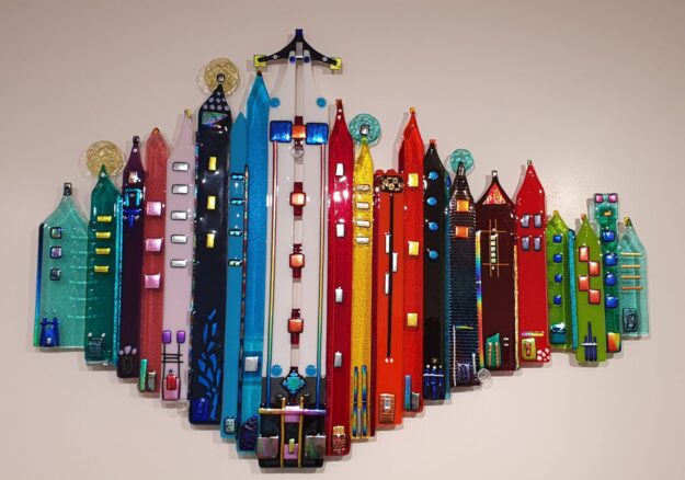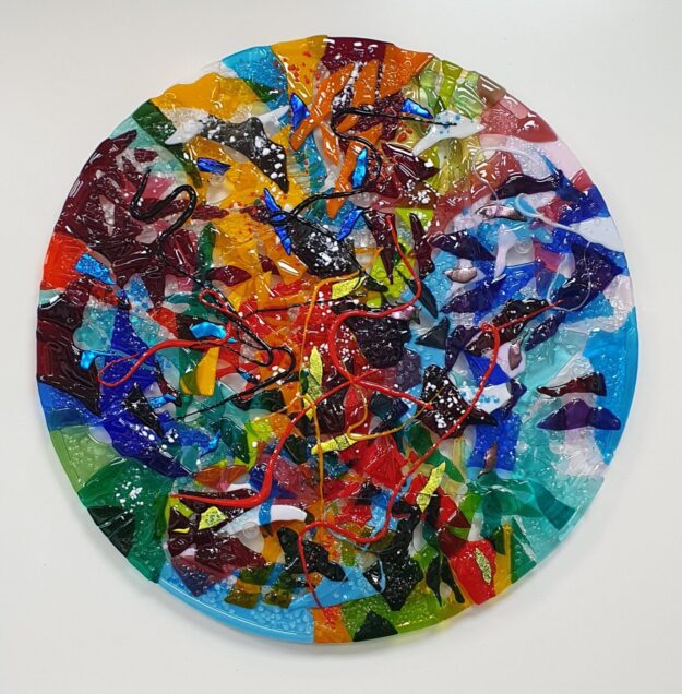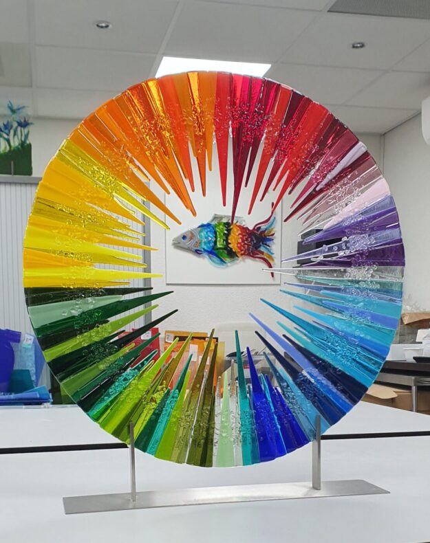 Abstract rond met de titel “It is a Beautiful Day” Doorsnede 70 cm Kan aan de muur hangen met speciale afstandssteunen. Die worden bijgbeleverd. Kleurrijk object, een blikvanger aan de wand. Evt. kan dit glasobject ook op een hoog of standaard staan. Dit glasobject is net uit de glasoven en hangt nog in mijn atelier.…