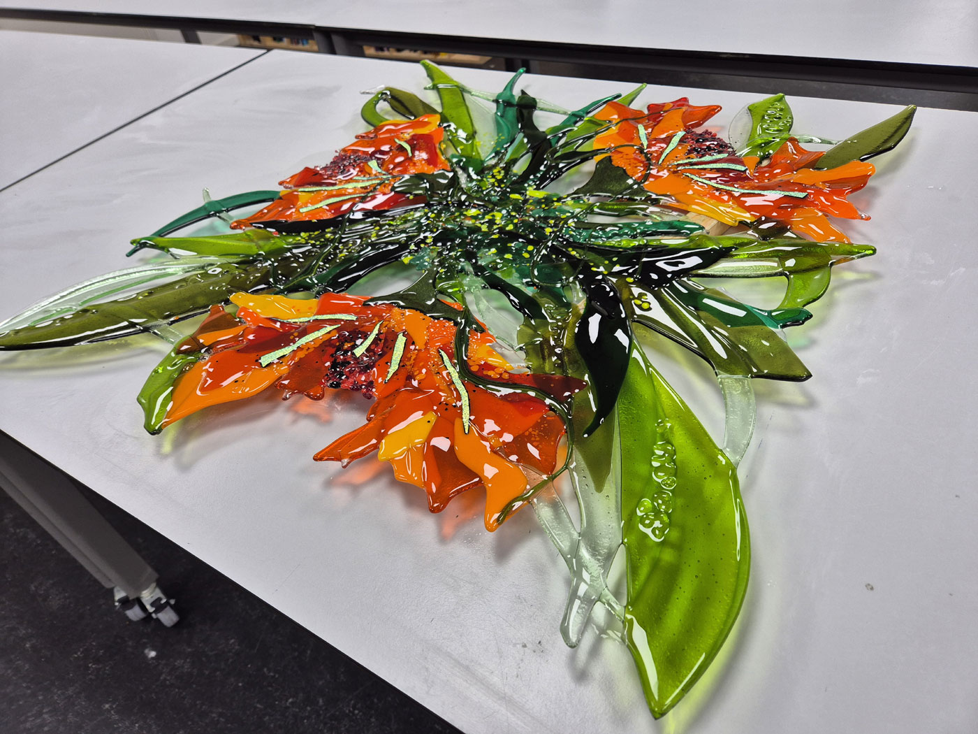 Hieronder een paar foto’s plat op de tafel, toen ie net uit de glasoven kwam.